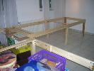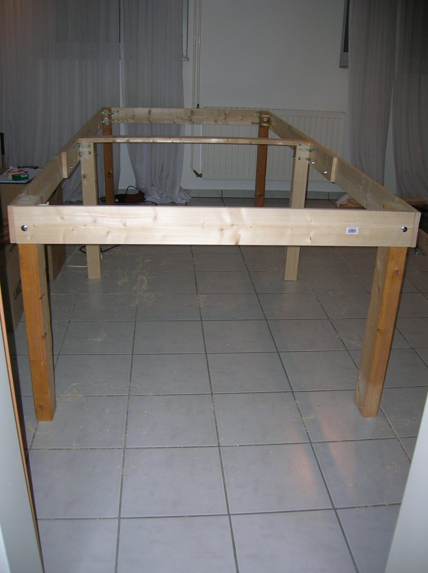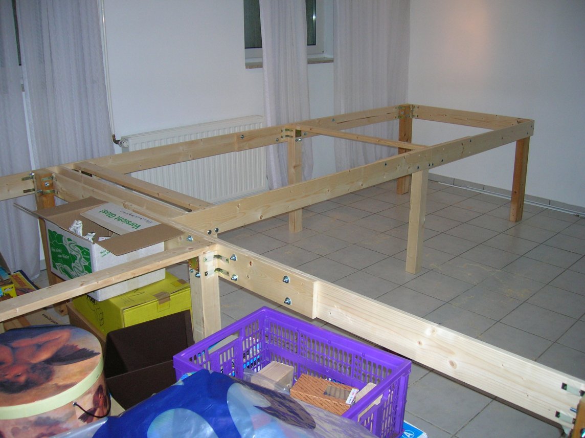 Heute wird mit dem Bau des Rahmens begonnen. Der Rahmen besteht aus zwei Gestellen, die zusammengeschoben werden sollen. Erst hat sich der der Sägergehilfe geziert, die Holzteile zuzusägen, aber ich bin ja wohlweißlich morgens in den Hellweg gefahren, um dem Wochenend-PFR zu entgehen.