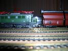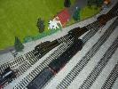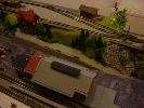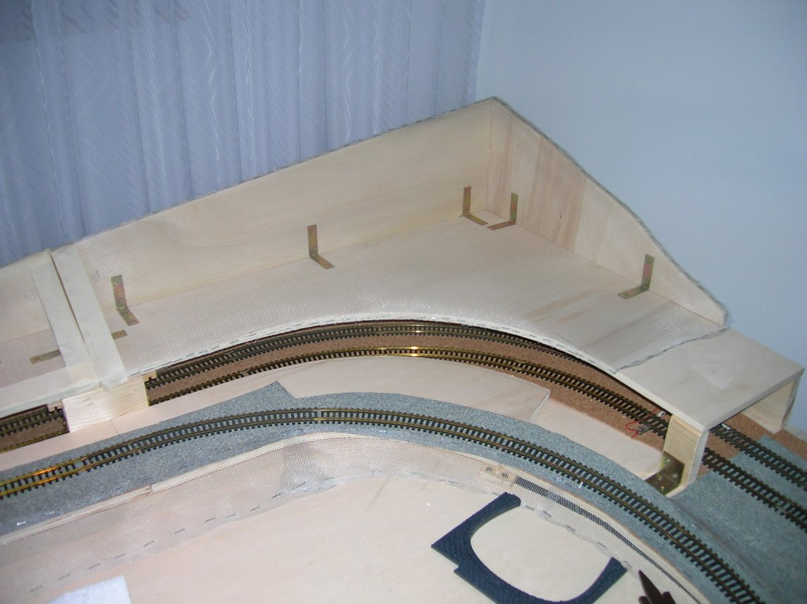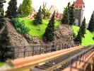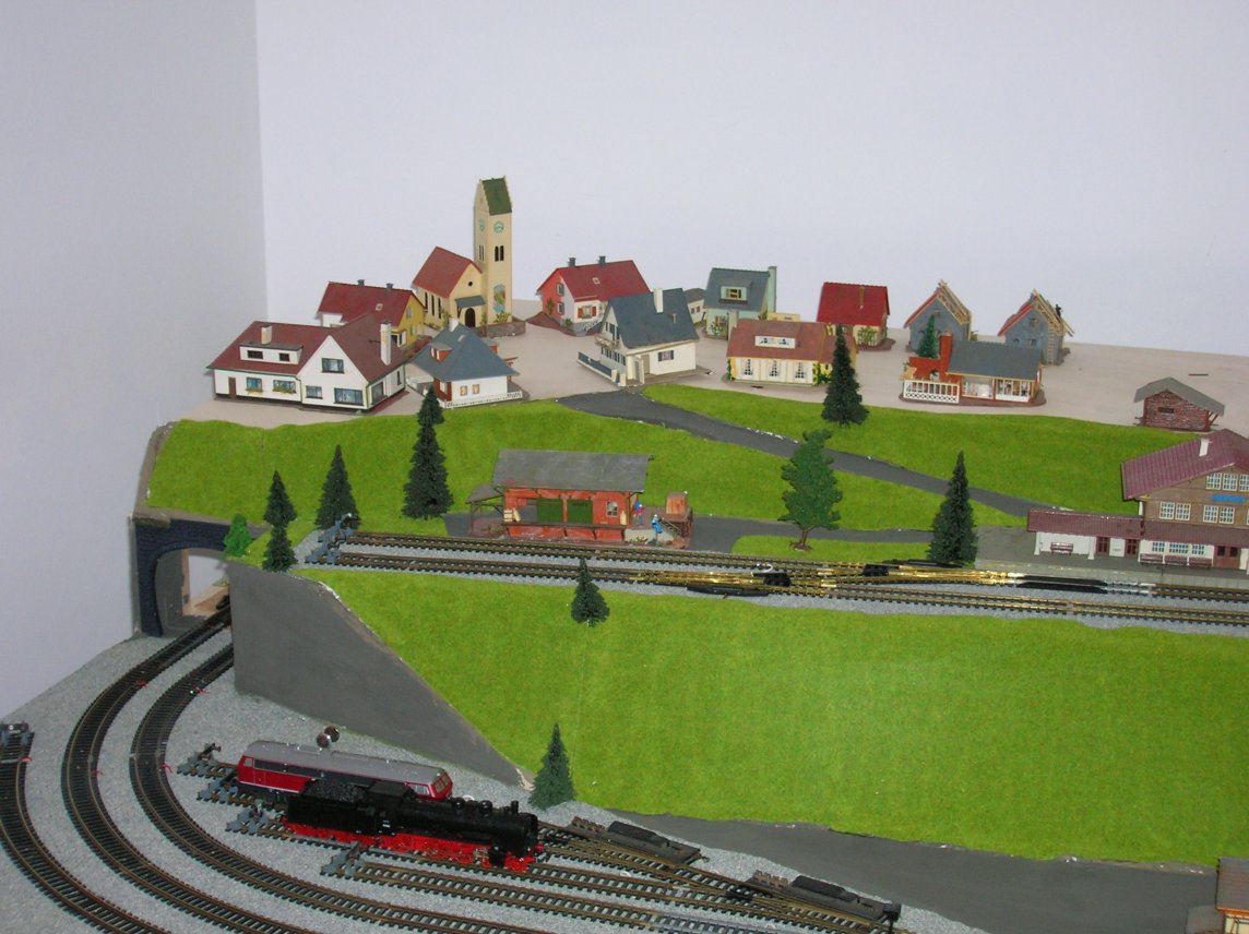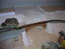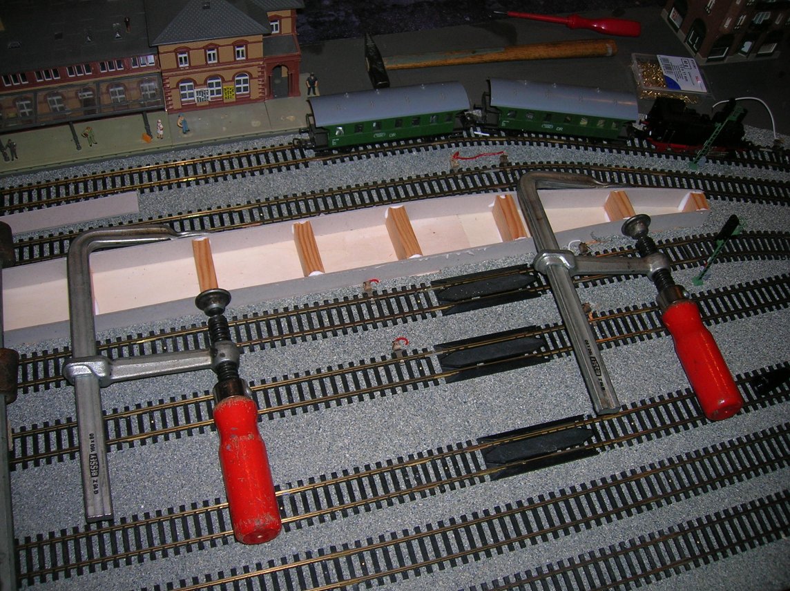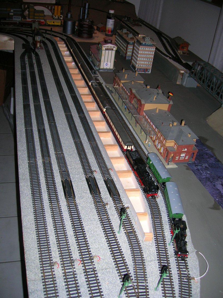 Auf dem Bild kann man auch sehr schön erkennen, wie das erste Stück der Bergauffahrt gebaut wurde. Es wurde ein entsprechend geformter Ausschnitt in der Grundplatte ausgesägt und im ausreichendem Abstand mit einem Holzstück unterfüttert. Das erste Stück muss mindestens so lang sein, dass die Eigendicke und die Stärke des unterfütterten Holzes zusammen nicht für eine zu starke Steigung sorgt. Im Allgemeinen sollten 4cm pro geradem Meter Steigung nicht überschritten werden. Das erscheint aber schon als Steilwandbahnerei. Weniger sieht besser aus und ührt zu weniger Problemen bei leichten Loks. In Kurven sollte die Steigung noch flacher sein, da die Reibung schon durch die Kurve nochmals erhöht wird.
