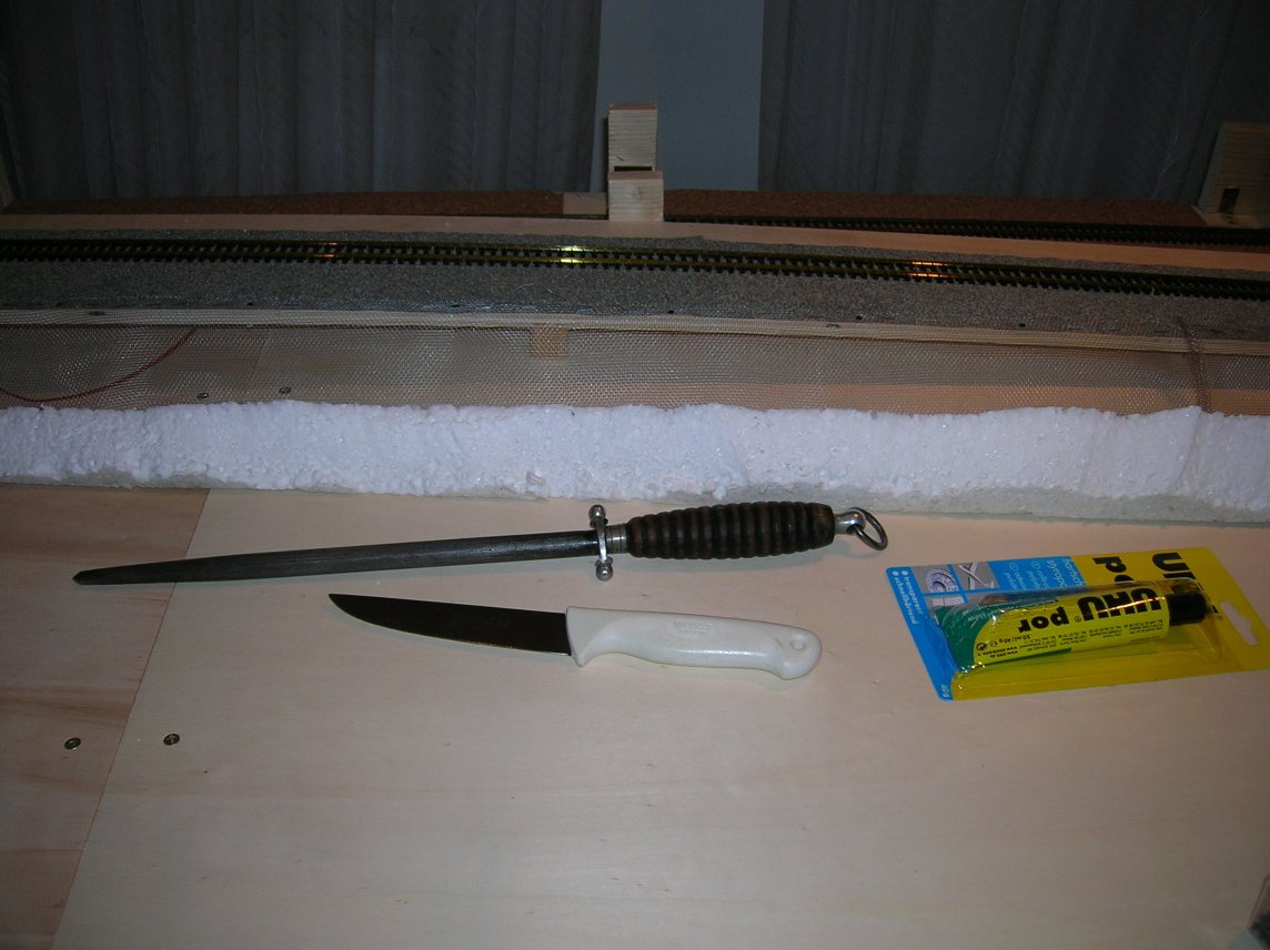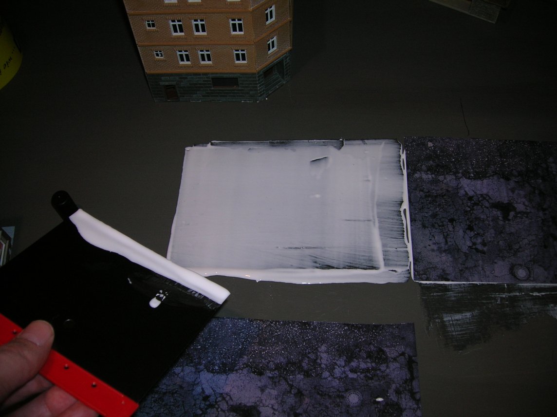 Ich habe angefangen, den Bahnhof zu fixieren. Dazu wird unter die Gleise eine Schottermatte gelegt werden. Das ist nichts Anderes, als auf