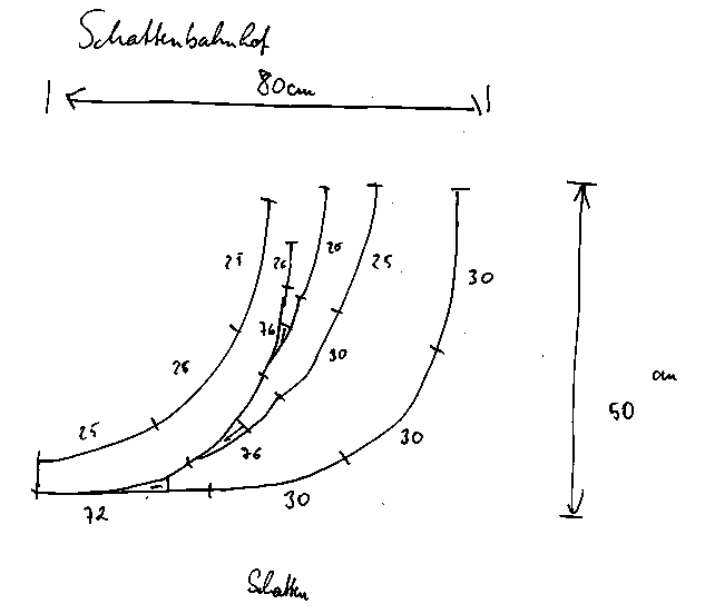 Die Planung lässt auch einen Schattenbahnhof zu. Dieser soll auf der linken Seite vorhanden sein. Hier wird eine Schenkelbreite von